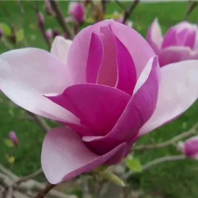 Крупные ароматные цветки чашевидной или бокаловидной формы, внешне напоминают мелкие тюльпаны. Диаметр цветков до 20-25 см, окрашены в белые, розовые, красные (иногда двухцветные) тона. Цветение магнолии наступает очень рано, до появления листьев, в период, когда большинство садовых деревьев еще не цветет. Это время, чаще всего, — апрель или начало мая. Цветет магнолия, начиная с раннего возраста. Плоды созревают осенью.