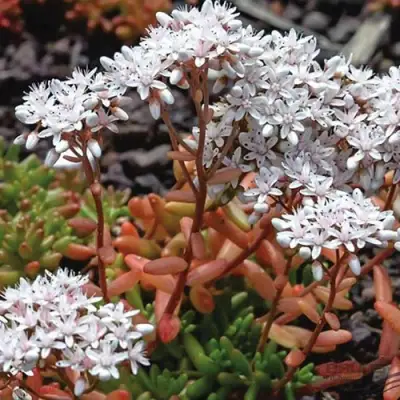 Очиток Корал Карпет белый — это выносливый почвопокровник, созданный для участков, где большинству растений попросту не выжить. Он равномерно закрывает поверхность, устойчив к засухе, жаре, морозу и при этом сохраняет декоративность в течение всего сезона. Белая форма популярного сорта Корал Карпет демонстрирует плотный зелёно-бронзовый ковёр с изящным летним цветением, которое делает этот седум не только функциональным, но и выразительным элементом ландшафта.