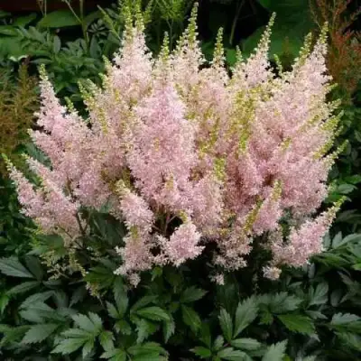 Астильба Юник Салмон радует обильным, пушистым цветением. Конические соцветия высотой до 30 см густо усыпаны мелкими бледно-лососево-розовыми цветками, слегка ароматными и привлекающими внимание. Цветение начинается в начале июня и продолжается до июля, радуя глаз в течение 20 дней.
