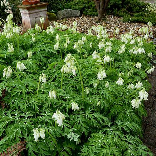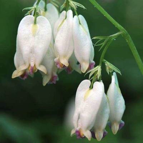 У сорта Аврора цветение начинается в мае, когда куст выбрасывает серию изящных цветоносов. На каждом побеге формируются аккуратные поникающие кисти, усыпанные десятками миниатюрных сердцевидных цветков размером 1–1,5 см. Белый цвет особенно ярко смотрится в полутени, создавая эффект “подсветки” внутри посадки. Цветки располагаются равномерно и раскрываются последовательно, благодаря чему растение сохраняет декоративность до октября, практически не делая пауз. Это одно из лучших непрерывноцветущих решений среди дицентры: цветоносы обновляются постоянно, а выцветшие кисти быстро сменяются новыми. Аромата почти нет, зато визуальный эффект превосходный даже при слабом освещении.