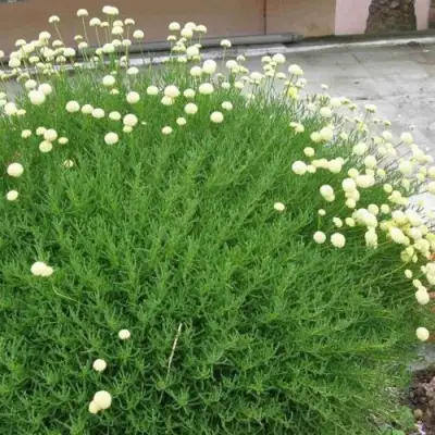 Цветки Сантолины заслуживают отдельного внимания. Они небольшие, диаметром около 1,5–2 см, собраны в компактные шаровидные корзинки на длинных цветоносах. Окрас цветка молочно-жёлтый, яркий даже на фоне густой зелёной листвы. Цветение начинается в июне и продолжается до конца июля, создавая выразительный декоративный акцент. Лёгкий, свежий аромат цветов добавляет саду летнюю атмосферу и привлекает полезных насекомых, включая пчёл.
