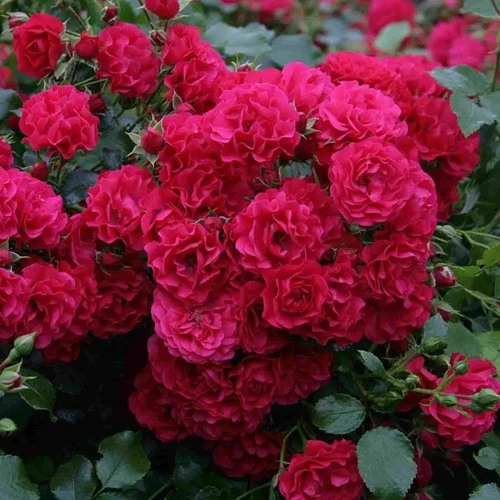 Цветение обильное, продолжительное: с начала июня и до поздней осени. Цветки мелкие (до 5 см), густомахровые, собраны в плотные соцветия. Окрас — насыщенно-красный, с глубоким малиновым подтоном. Даже при сильном солнце лепестки не выгорают. Цветы формируются в кистях по 5–15 штук, и благодаря самоочищающемуся типу лепестков куст всегда выглядит ухоженным. Аромат слабый, почти незаметный.